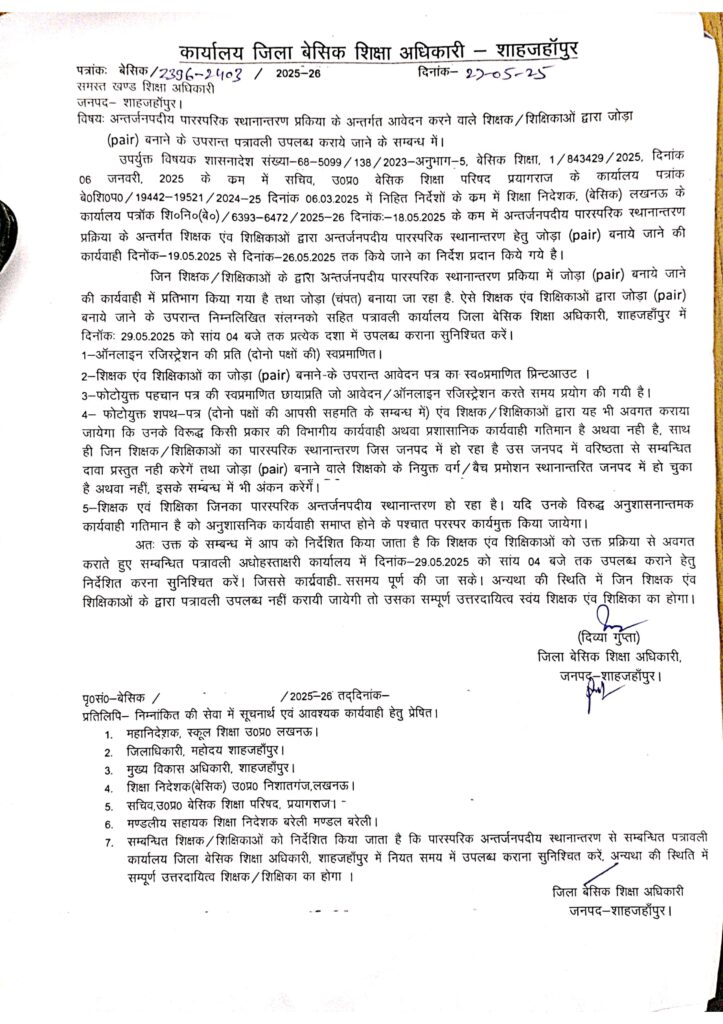 जिन शिक्षक/शिक्षिकाओं के द्वारा अन्तर्जनपदीय पारस्परिक स्थानान्तरण प्रकिया में जोड़ा (pair) बनाये जाने की कार्यवाही में प्रतिभाग किया गया है तथा जोड़ा (चंपत) बनाया जा रहा है. ऐसे शिक्षक एंव शिक्षिकाओं द्वारा जोड़ा (pair) बनाये जाने के उपरान्त निम्नलिखित संलग्नको सहित पत्रावली कार्यालय जिला बेसिक शिक्षा अधिकारी, शाहजहाँपुर में दिनांक: 29.05.2025 को सांय 04 बजे तक प्रत्येक दशा में उपलब्ध कराना सुनिश्चित करें।