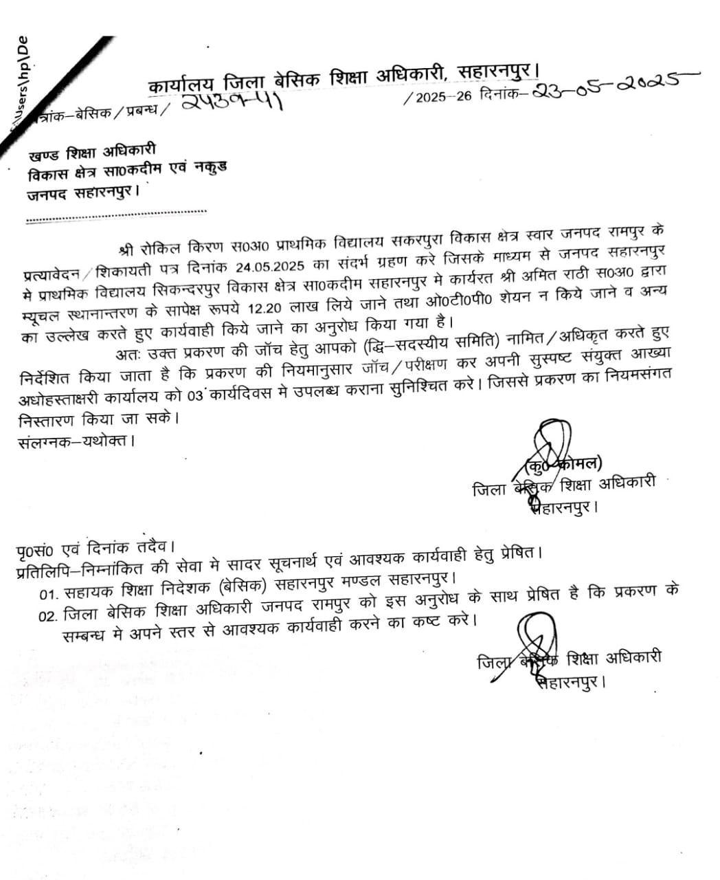 जिले में 12.20 लाख रुपए लेकर भी म्युचुअल ट्रांसफर के लिए ओटीपी न शेयर करने की बीएसए से शिकायत