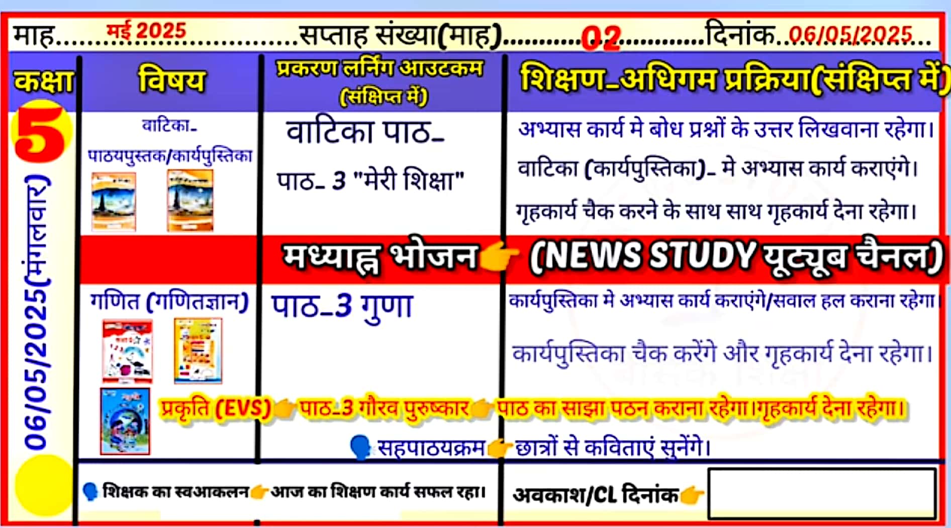 Teacher diary: दिनांक 06,07 मई , 2025 कक्षा- 01, 02, 03, 04, 05 की भरी हुई शिक्षक डायरी , देखें