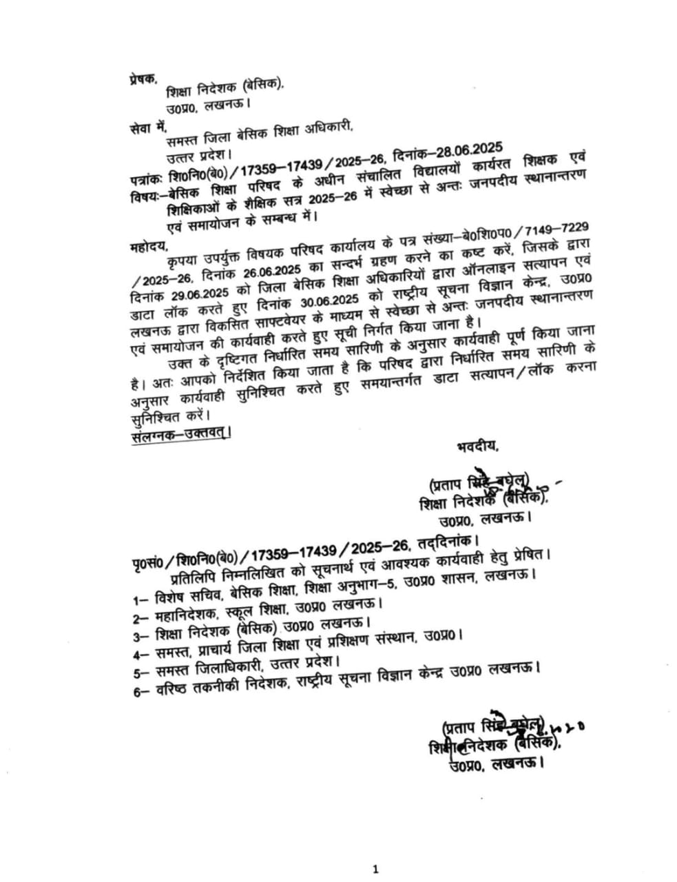 करनी है। इसे देखते हुए बेसिक शिक्षा निदेशक प्रताप सिंह बघेल ने सभी बीएसए को निर्देश दिए हैं कि वह 29 जून को समय सारिणी के अनुसार ऑनलाइन सत्यापन कर डाटा लॉक करें। ताकि 30 जून को तबादला सूची जारी की जा सके