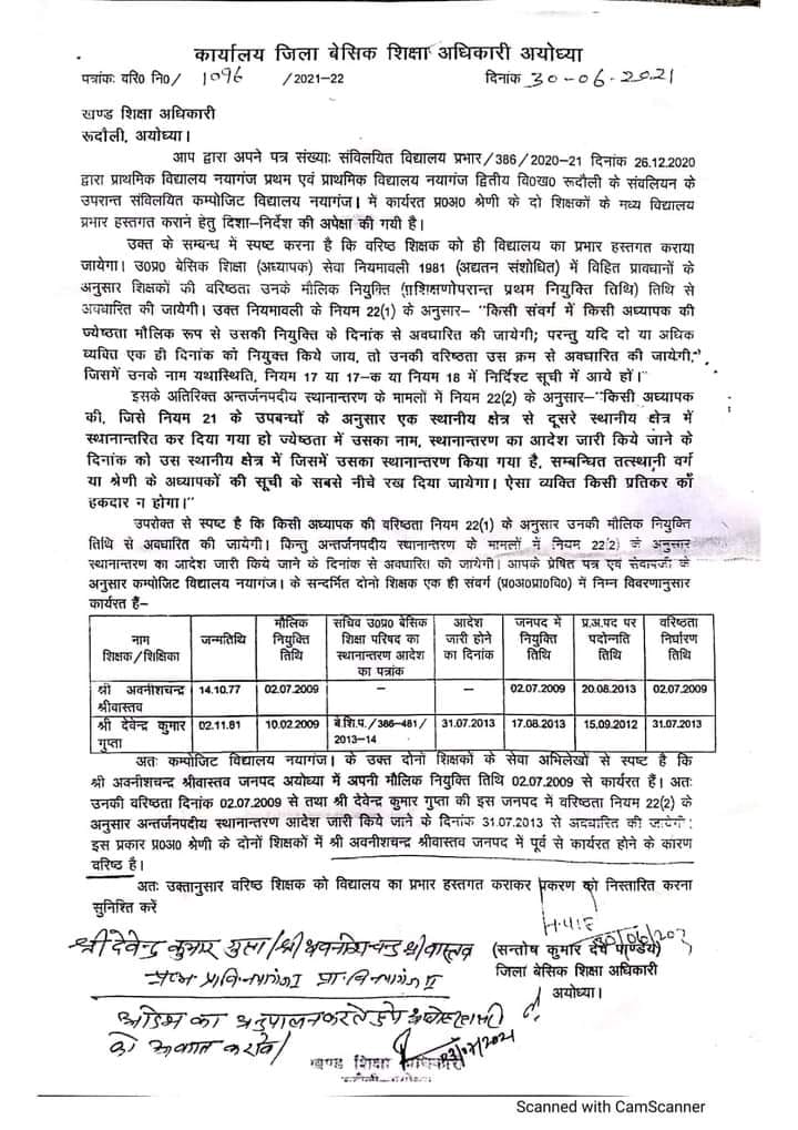 जिला बेसिक शिक्षा अधिकारी अयोध्या ने वरिष्ठ शिक्षक को ही विद्यालय का प्रभार सौंपे जाने का आदेश जारी किया।