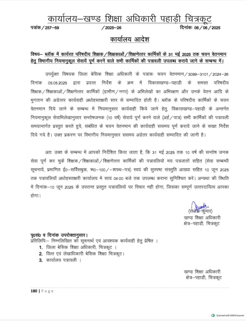 ब्लॉक में कार्यरत परिषदीय शिक्षक / शिक्षकाओं/शिक्षणेत्तर कार्मिकों के 31 मई 2025 तक चयन वेतनमान हेतु विभागीय नियमानुकूल सेवायें पूर्ण करनें वाले सभी कार्मिकों की पत्रावली उपलब्ध कराये जाने के सम्बन्ध में।