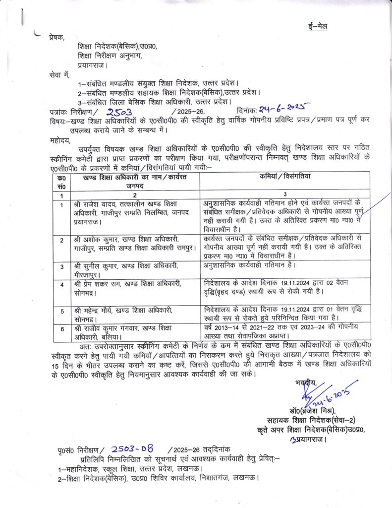 खण्ड शिक्षा अधिकारियों के ए०सी०पी० के प्राप्त प्रकरणों में आपत्तियों से संबंधित।