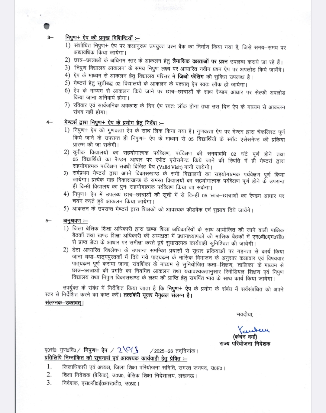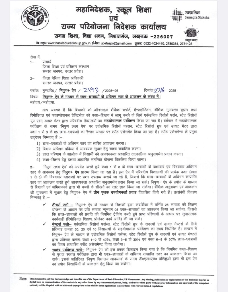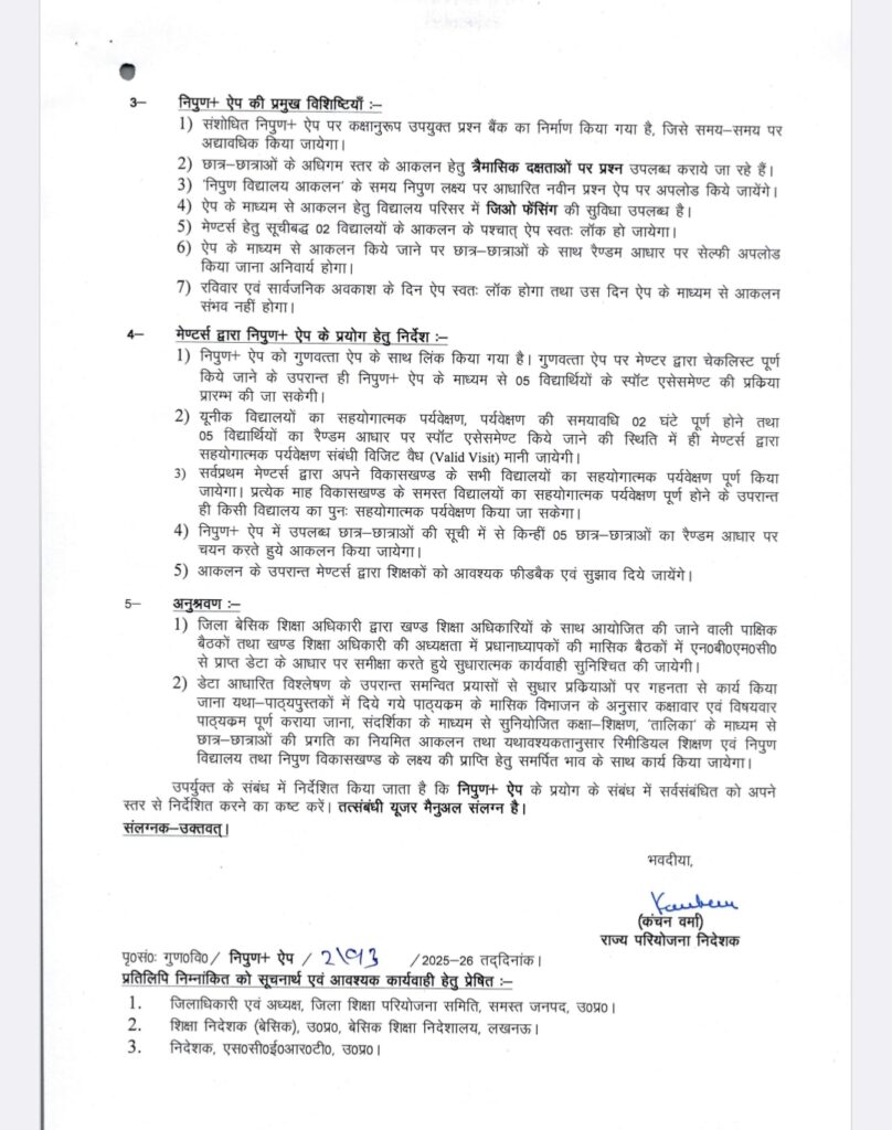 कृपया संलग्न पत्र का अवलोकन करने का कष्ट करें, जो *कक्षा 1 से 8 तक के छात्र-छात्राओं के आकलन हेतु निपुण+ ऐप प्रारंभ किये जाने के सम्बन्ध में है।*