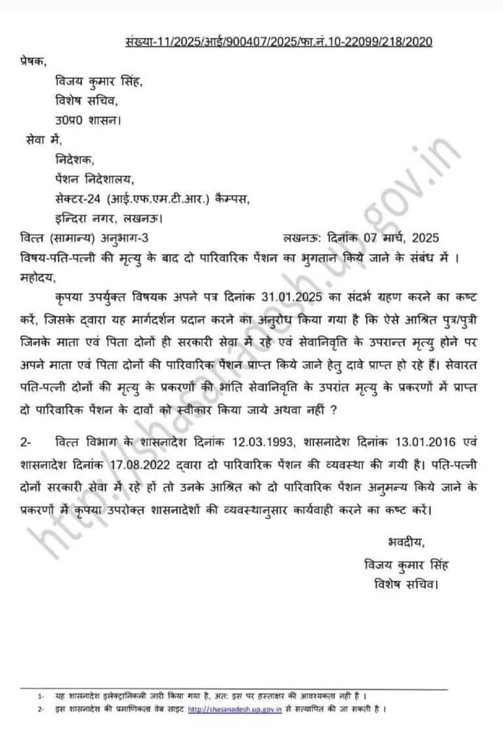 पति पत्नी दोनों सरकारी सेवा में रहे हों हों तो उनके आश्रित को दो पारिवारिक पेंशन अनुमन्य किये जाने के शासनादेशों की व्यवस्थानुसार कार्यवाही करने का कष्ट करें
