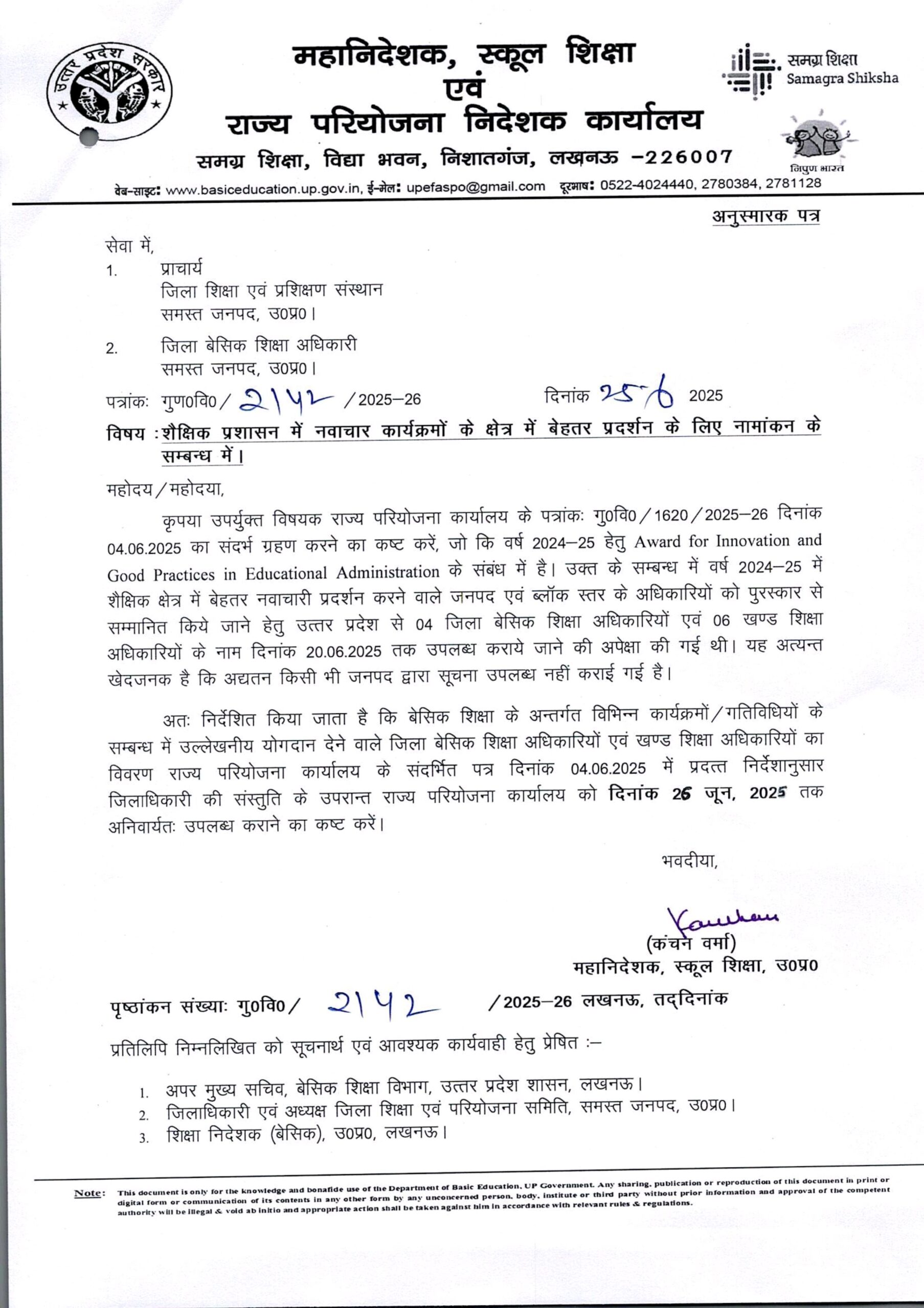 शैक्षिक प्रशासन में नवाचार कार्यक्रमों के क्षेत्र में बेहतर प्रदर्शन के लिए नामांकन के सम्बन्ध में।
