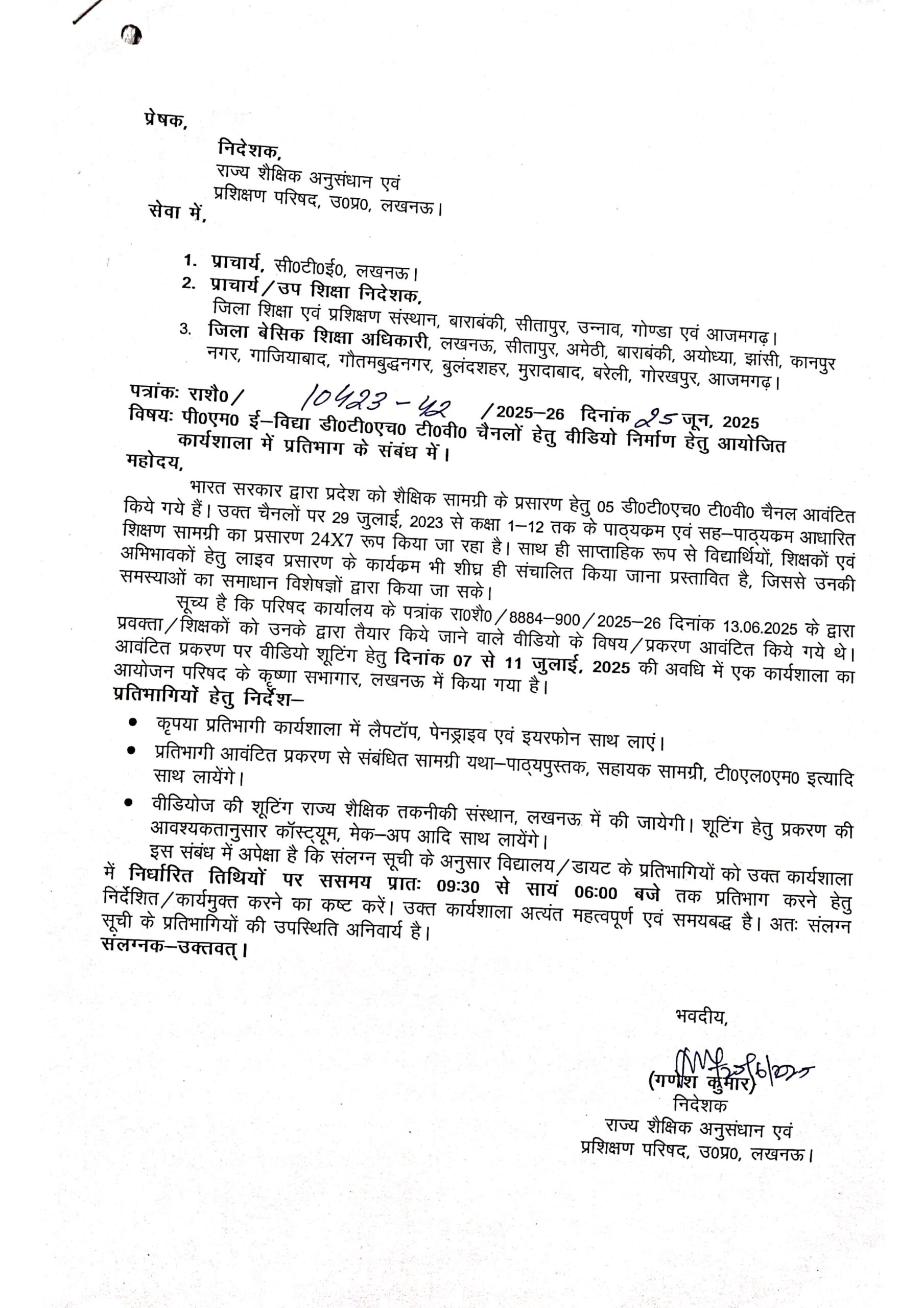 पी०एम० ई-विद्या डी०टी०एच० टी०वी० चैनलों हेतु वीडियो निर्माण हेतु आयोजित कार्यशाला में प्रतिभाग के संबंध में।
