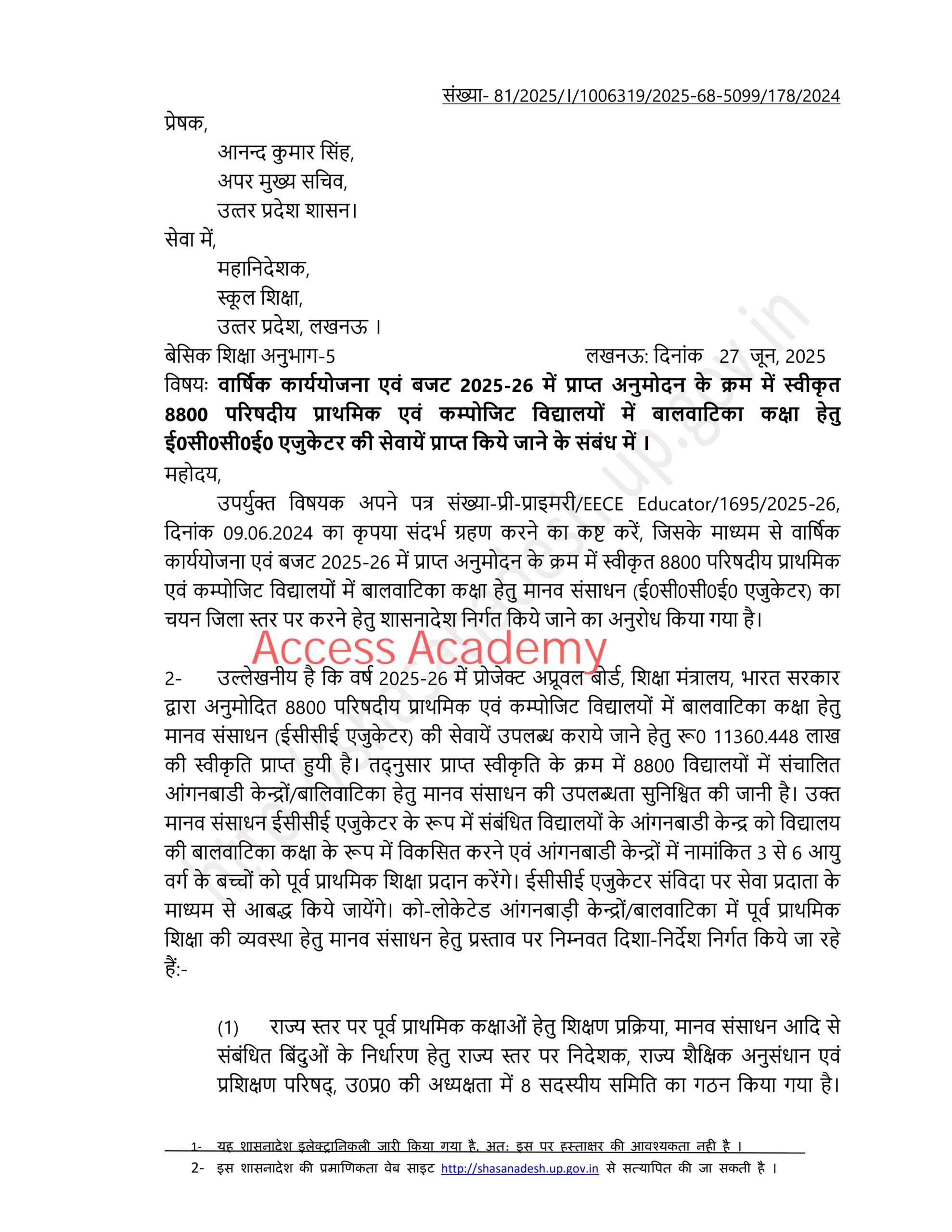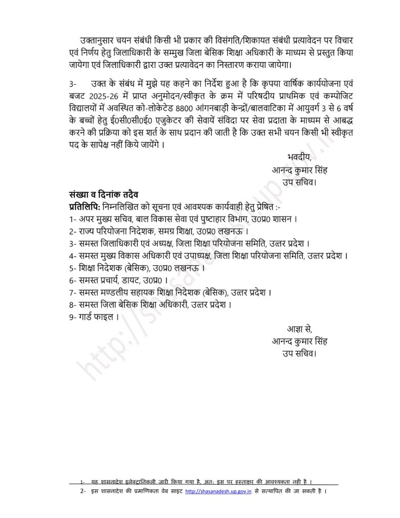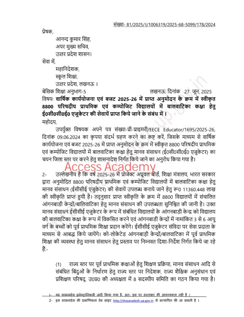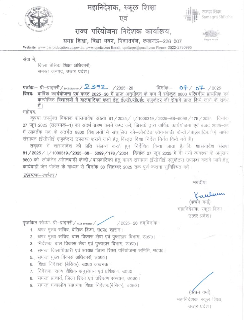 वार्षिक कार्ययोजना एवं बजट 2025- 26 में प्राप्त अनुमोदन के क्रम में स्वीकृत 8800 परिषदीय प्राथमिक एवं कंपोजिट विद्यालयों में बाल वाटिका कक्षा हेतु ECCE एजुकेटर की सेवाएं प्राप्तकिए जाने के संबंध में
