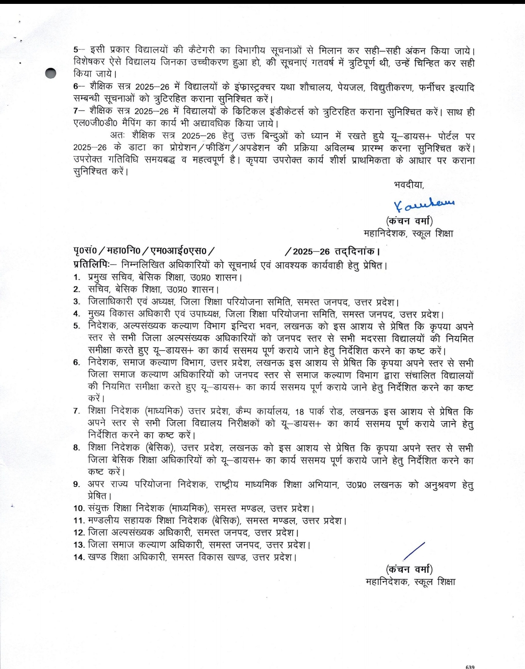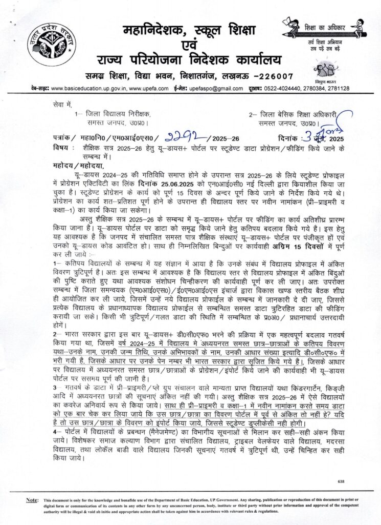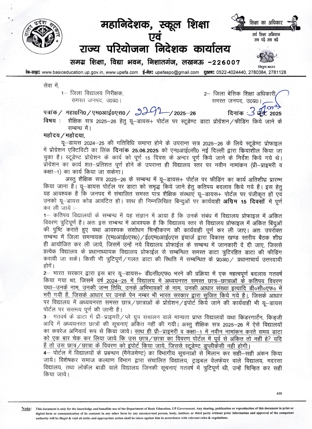 यू-डायस पोर्टल पर स्टूडेण्ट डाटा प्रोग्रेशन / फीडिंग किये जाने के सम्बन्ध में।