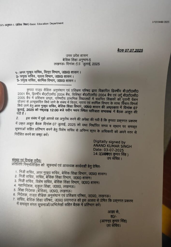 पुरानी पेंशन मामले में शासन में 07/07/2025 को होने वाली बैठक का आदेश