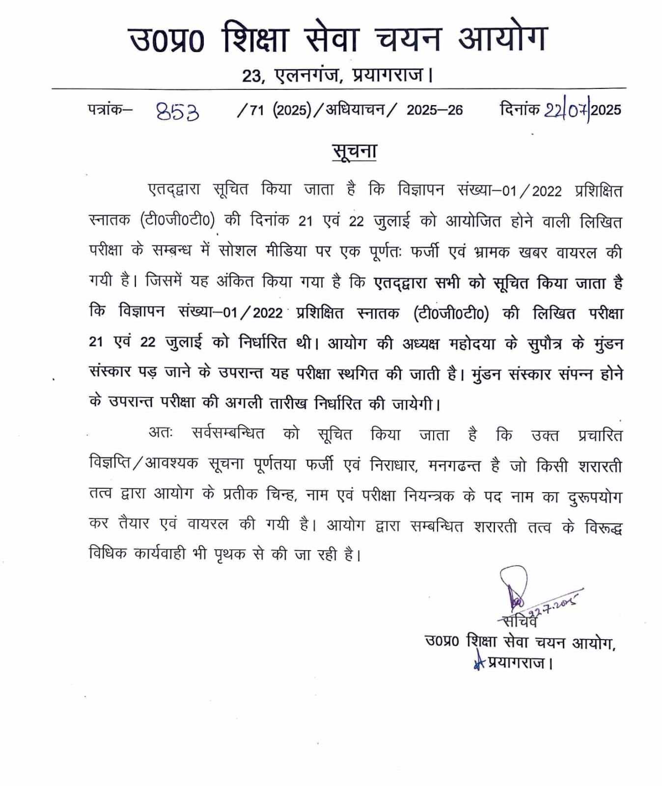 उत्तर प्रदेश शिक्षा सेवा चयन आयोग की तरफ से TGT परीक्षा वायरल खबर के संबंध में स्पष्टीकरण जारी 👇