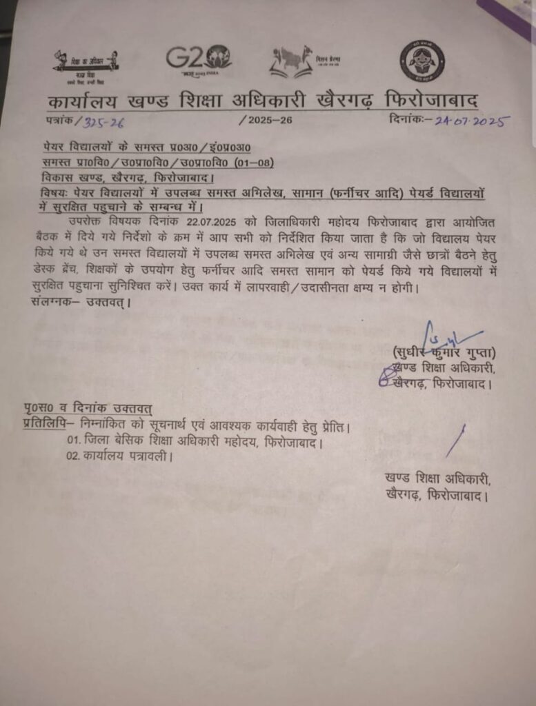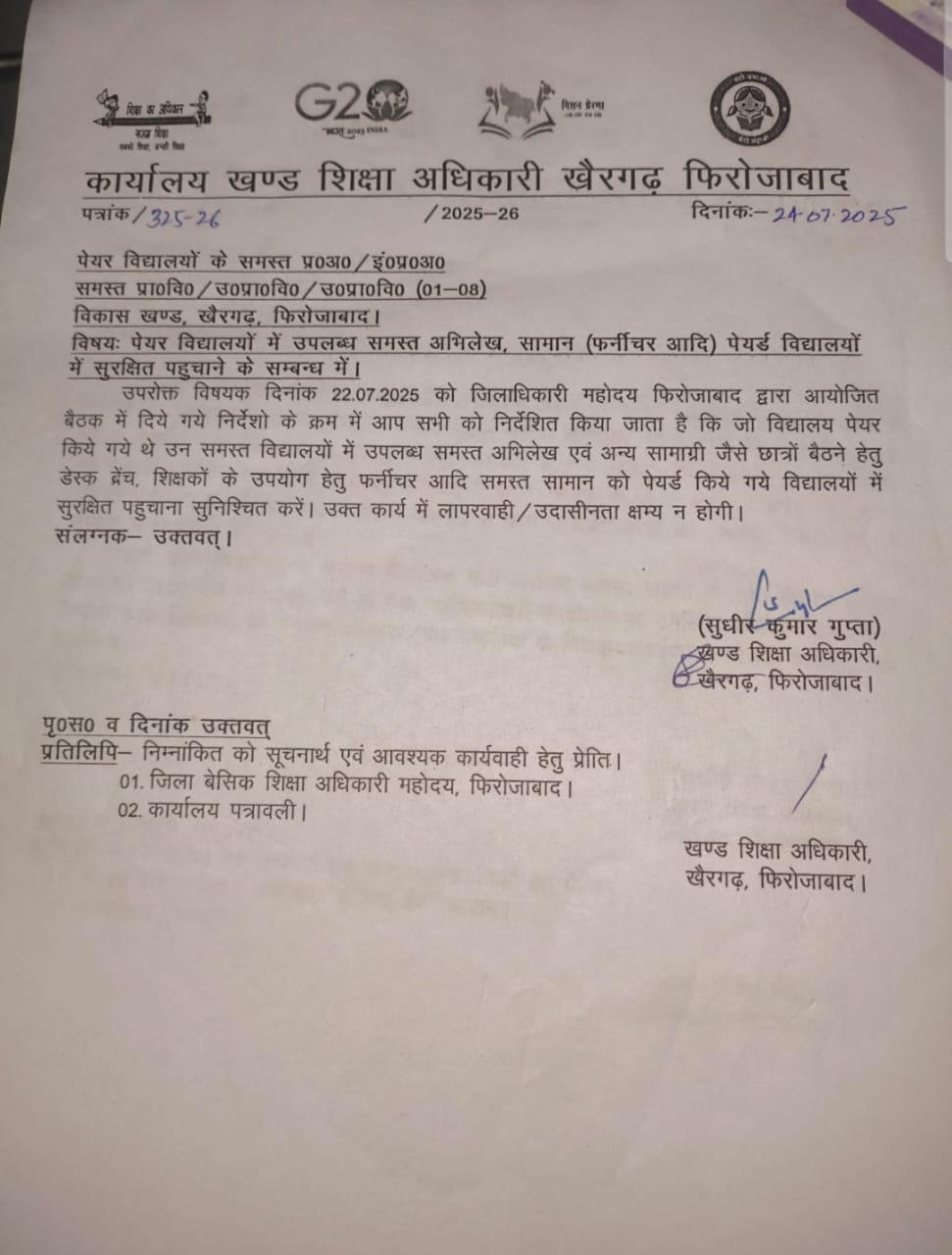 पेयर विद्यालयों में उपलब्ध समस्त अभिलेख, सामान (फर्नीचर आदि) पेयर्ड विद्यालयों में सुरक्षित पहुंचाने के सम्बन्ध में।
