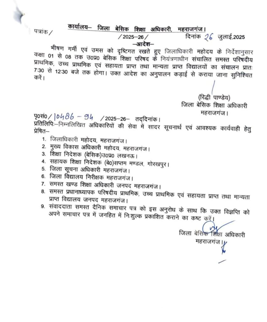 Home PRIMARY KA MASTER DISTRICT NEWS CHANNEL महाराजगंज :भीषण गर्मी को देखते हुए BSA ने परिषदीय विद्यालयों के समय में किया परिवर्तन,दोपहर 12:30 बजे चलेगी कक्षाएं।