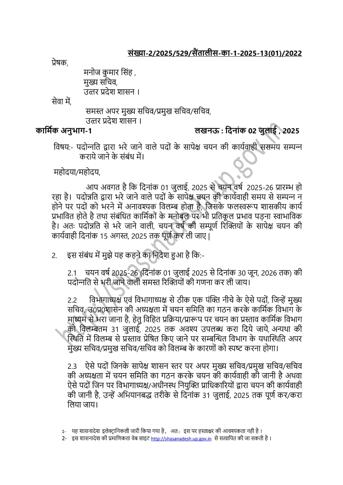 पदोन्नति द्वारा भरे जाने वाले पदों के सापेक्ष चयन की कार्यवाही ससमय संपन्न कराए जाने के संबंध में