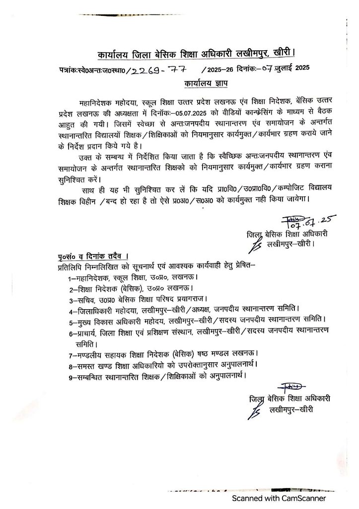 स्वैच्छिक अंतः जनपदीय स्थानांतरण/समायोजन में शिक्षकों को रिलीव करने के संबंध में आदेश जारी