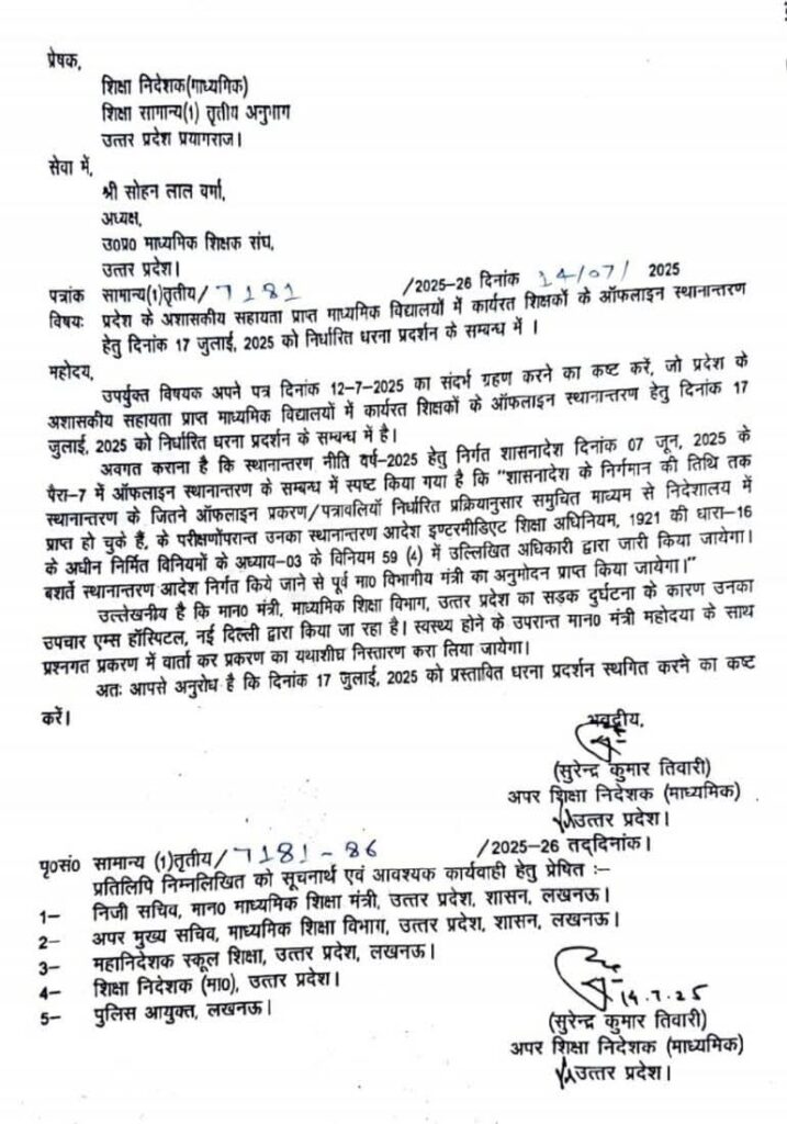 प्रदेश के अशासकीय सहायता प्राप्त माध्यमिक विद्यालयों में कार्यरत शिक्षकों के ऑफलाइनस्थानान्तरण हेतु दिनांक 17 जुलाई, 2025 को निर्धारित धरना प्रदर्शन के सम्बन्ध में