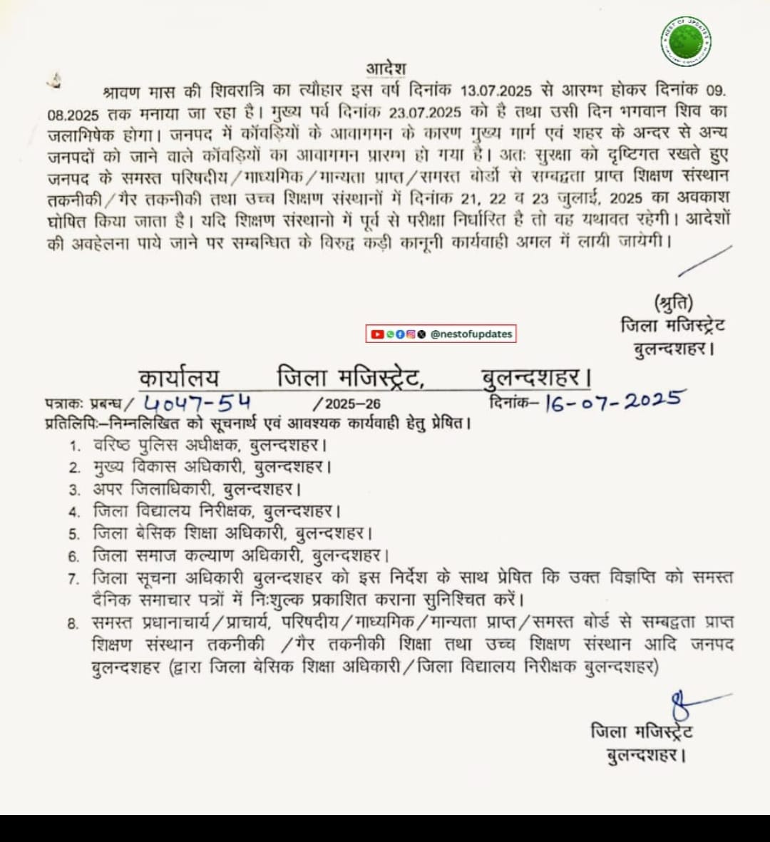 श्रावण मास की शिवरात्रि का त्यौहार इस वर्ष दिनांक 13.07.2025 से आरम्भ होकर दिनांक 09. 08.2025 तक मनाया जा रहा है। मुख्य पर्व दिनांक 23.07.2025 को है तथा उसी दिन भगवान शिव का जलाभिषेक होगा। जनपद में कॉवड़ियों के आवागमन के कारण गुख्य मार्ग एवं शहर के अन्दर से अन्य जनपदों को जाने वाले कॉवड़ियों का आवागमन प्रारम्भ हो गया है। अतः सुरक्षा को दृष्टिगत रखते हुए जनपद के समस्त परिषदीय / माध्यमिक/मान्यता प्राप्त/समस्त बोडों से सम्बद्धता प्राप्त शिक्षण संस्थान तकनीकी / गैर तकनीकी तथा उच्च शिक्षण संस्थानों में दिनांक 21, 22 व 23 जुलाई, 2025 का अवकाश घोषित किया जाता है। यदि शिक्षण संस्थानो में पूर्व से परीक्षा निर्धारित है तो वह यथावत रहेगी। आदेशों की अवहेलना पाये जाने पर सम्बन्धित के विरुद्ध कड़ी कानूनी कार्यवाही अमल में लायी जायेगी।