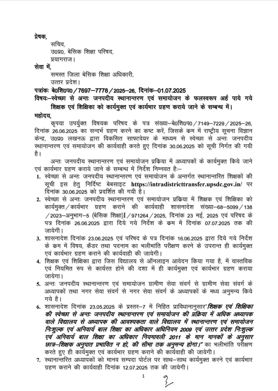 2. स्वेच्छा से अन्तः जनपदीय स्थानान्तरण एवं समायोजन प्रकिया में शिक्षक एवं शिक्षिका को कार्यमुक्त / कार्यभार ग्रहण कराने की कार्यवाही शासनादेश संख्या-68-5099/138 / 2023-अनुभाग-5 (बेसिक शिक्षा) 1/971264/2025, दिनांक 23 मई, 2025 एवं परिषद के पत्र दिनांक 26.06.2025 द्वारा दिये गये निर्देश के कम में दिनांक 07.07.2025 तक की जायेगी।