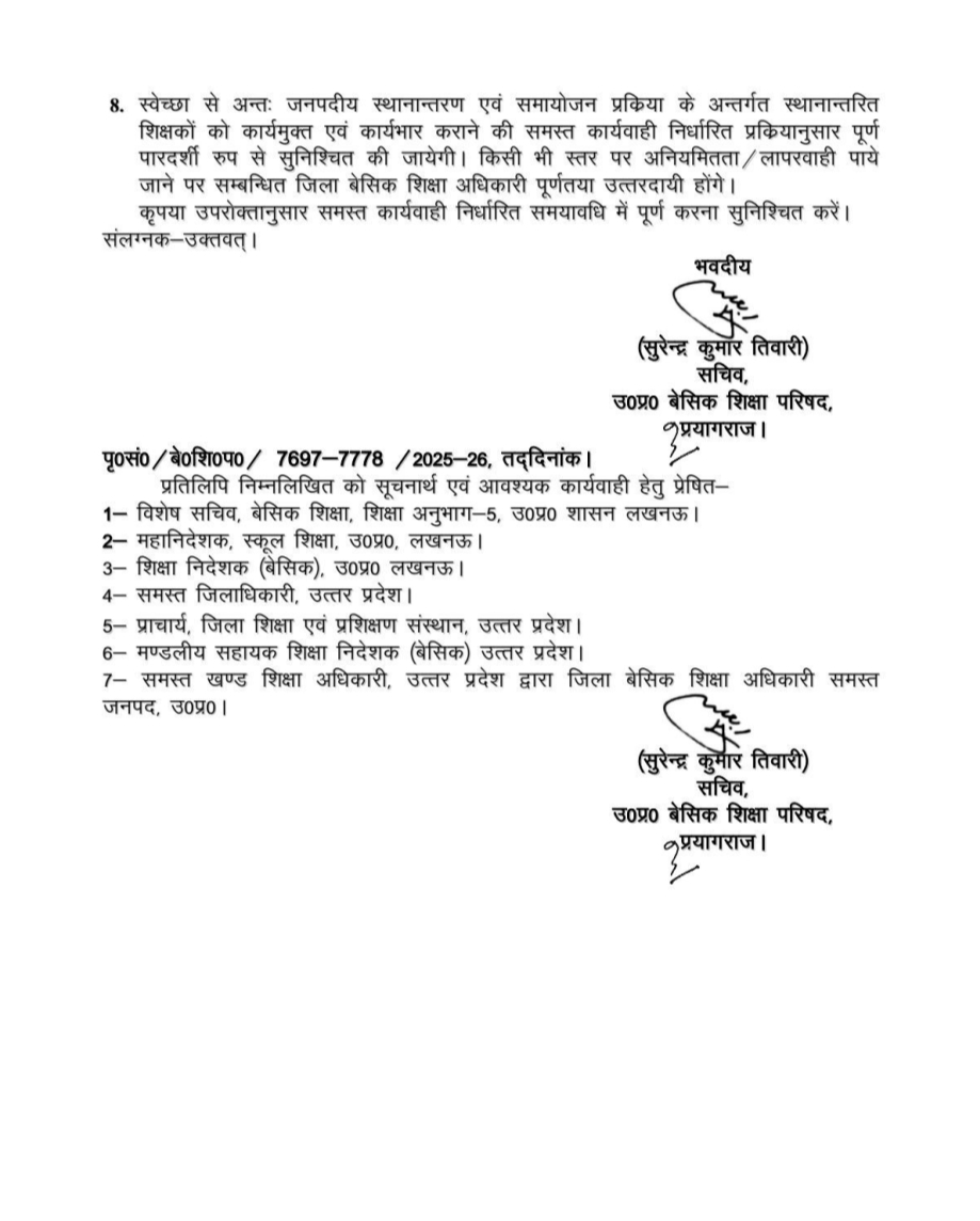 8. स्वेच्छा से अन्तः जनपदीय स्थानान्तरण एवं समायोजन प्रकिया के अन्तर्गत स्थानान्तरित शिक्षकों को कार्यमुक्त एवं कार्यभार कराने की समस्त कार्यवाही निर्धारित प्रकियानुसार पूर्ण पारदर्शी रुप से सुनिश्चित की जायेगी। किसी भी स्तर पर अनियमितता / लापरवाही पाये जाने पर सम्बन्धित जिला बेसिक शिक्षा अधिकारी पूर्णतया उत्तरदायी होंगे। कृपया उपरोक्तानुसार समस्त कार्यवाही निर्धारित समयावधि में पूर्ण करना सुनिश्चित करें।