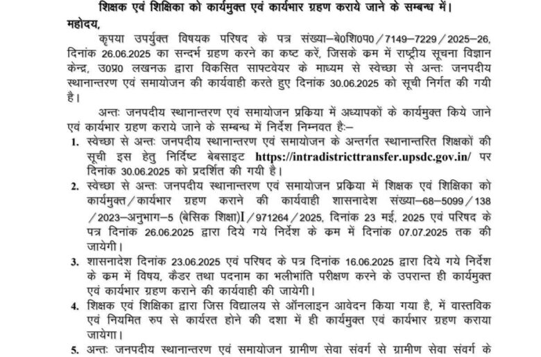 महोदय, स्वेच्छा से अन्तः जनपदीय स्थानान्तरण एवं समायोजन के फलस्वरूप अर्ह पाये गये शिक्षक एवं शिक्षिका को कार्यमुक्त एवं कार्यभार ग्रहण कराये जाने के सम्बन्ध में। महोदय, कृपया उपर्युक्त विषयक … Continue reading स्वेच्छा से अन्तः जनपदीय स्थानान्तरण एवं समायोजन के फलस्वरूप अर्ह पाये गये शिक्षक एवं शिक्षिका को कार्यमुक्त एवं कार्यभार ग्रहण कराये जाने के सम्बन्ध में।