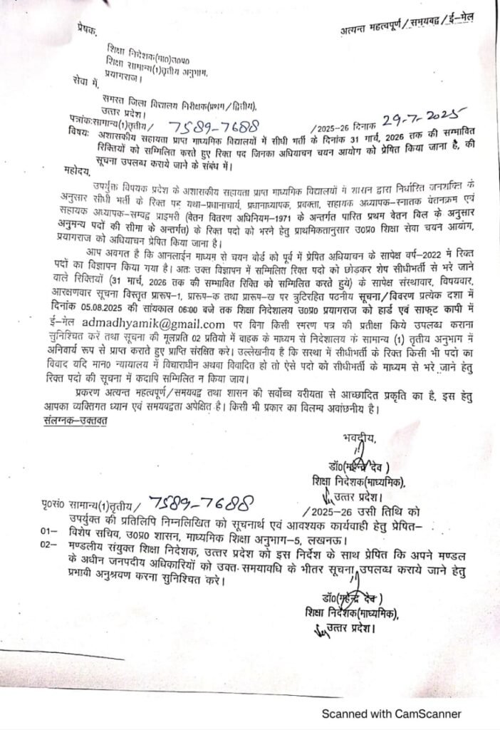 अशासकीय सहायता प्राप्त माध्यमिक विद्यालयों के टीचर्स के लिए 31 मार्च 2026 तक की संभावित भर्ती के लिए अधियाचन आमंत्रित
