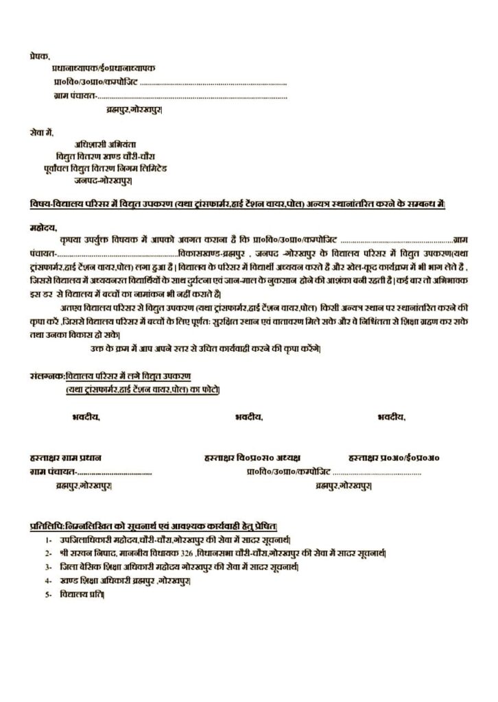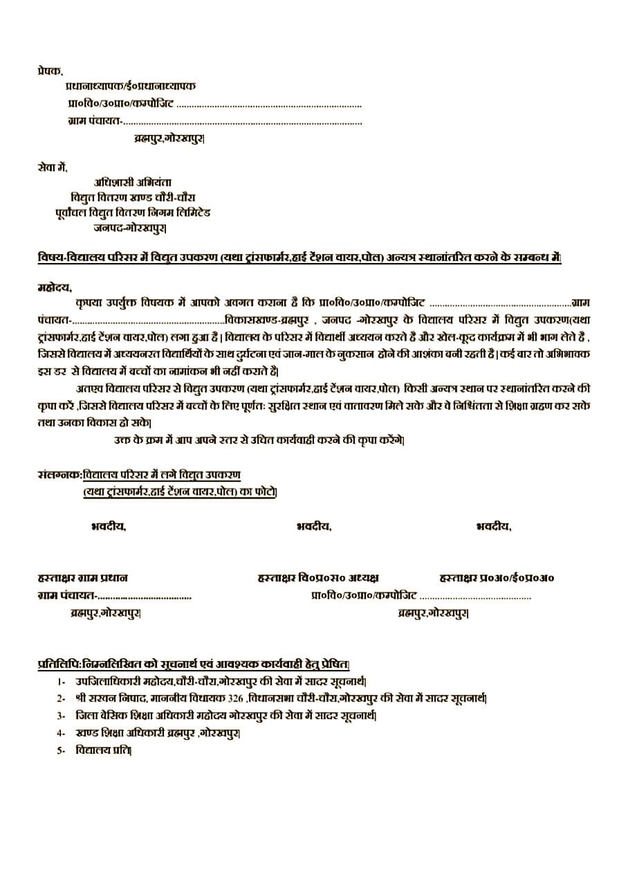 इस तरह दें हटवाने के लिए एप्लीकेशन : प्रदेश के परिषदीय विद्यालयों के भवनों के ऊपर से हाइपरटेंशन विद्युत लाइन हटाएं जाने के संबंध में 14 मई 2025 का आदेश