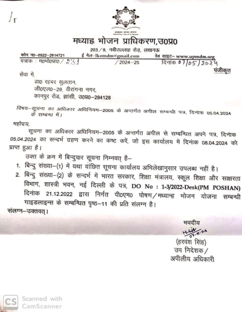 इसके जबाब में बताया गया कि प्राथमिक विद्यालय के प्रति छात्र को 450 कैलोरी एवं उच्च प्राथमिक के छात्र को 700 कैलोरी प्रतिदिन मिलना चाहिए।साथ ही प्राइमरी की छात्र को 12ग्राम प्रोटीन तथा उच्च प्राथमिक के छात्र को 20 ग्राम प्रोटीन प्रतिदिन देय है।
