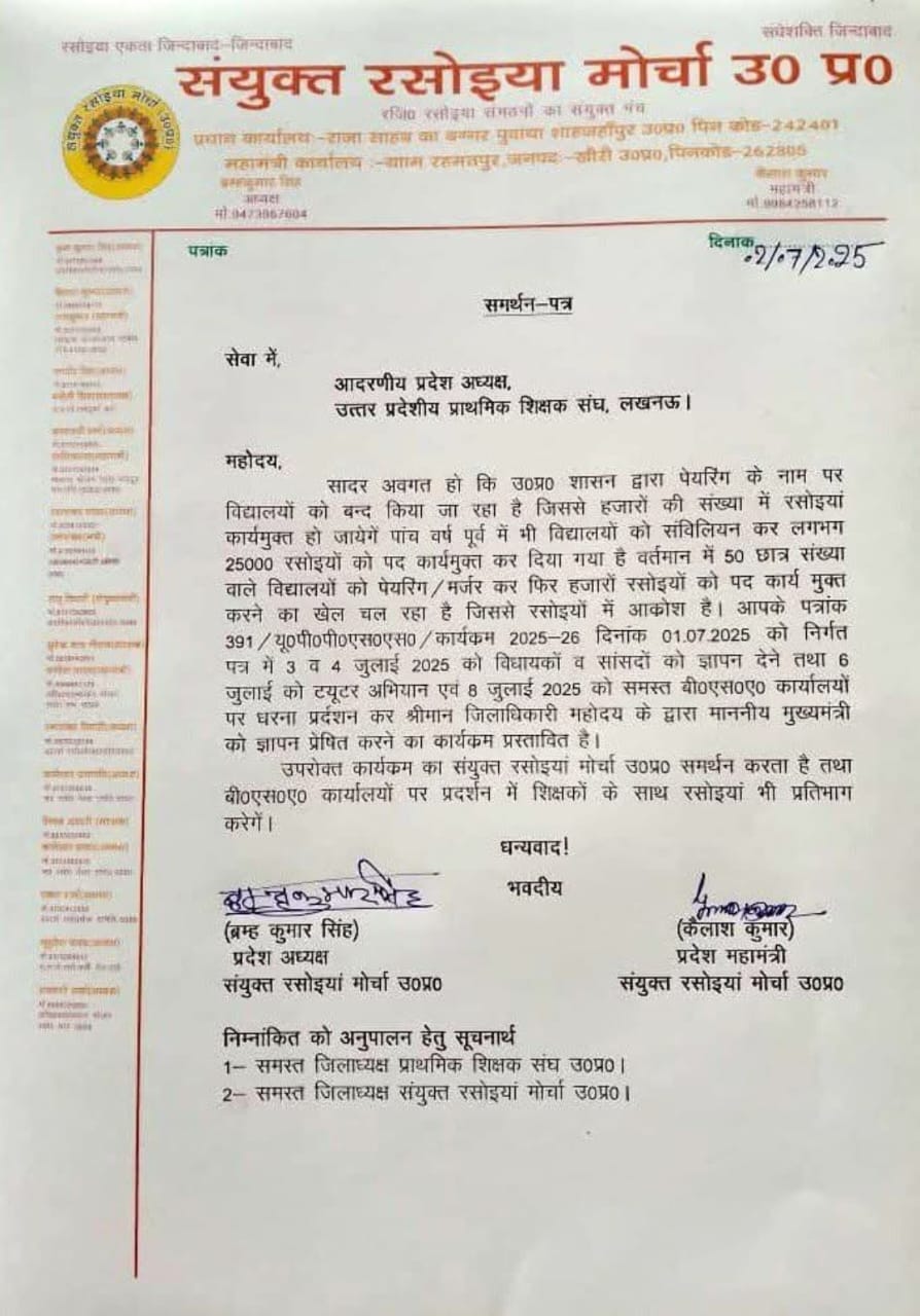 Home PRIMARY KA MASTER NEWS उत्तर प्रदेशीय प्राथमिक शिक्षक संघ द्वारा स्कूल मर्जर के खिलाफ़ आंदोलन को संयुक्त रसोईया मोर्चा, उत्तर प्रदेश का समर्थन पत्र जारी l
