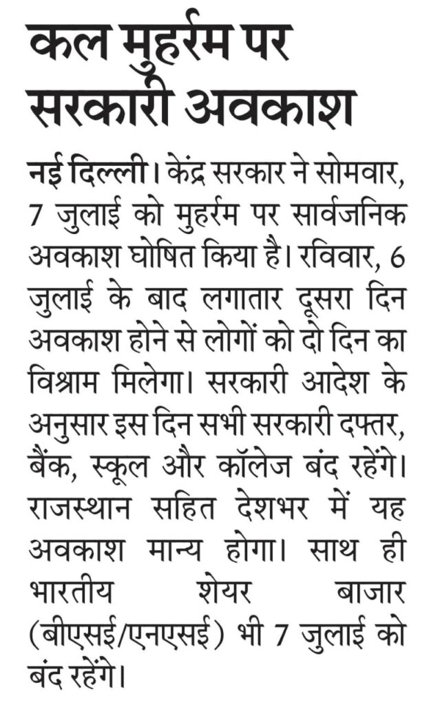 नई दिल्ली। केंद्र सरकार ने सोमवार, 7 जुलाई को मुहर्रम पर सार्वजनिक अवकाश घोषित किया है। रविवार, 6 जुलाई के बाद लगातार दूसरा दिन अवकाश होने से लोगों को दो दिन का विश्राम मिलेगा। सरकारी आदेश के अनुसार इस दिन सभी सरकारी दफ्तर, बैंक, स्कूल और कॉलेज बंद रहेंगे। राजस्थान सहित देशभर में यह अवकाश मान्य होगा। साथ ही भारतीय शेयर बाजार (बीएसई/एनएसई) भी 7 जुलाई को बंद रहेंगे।