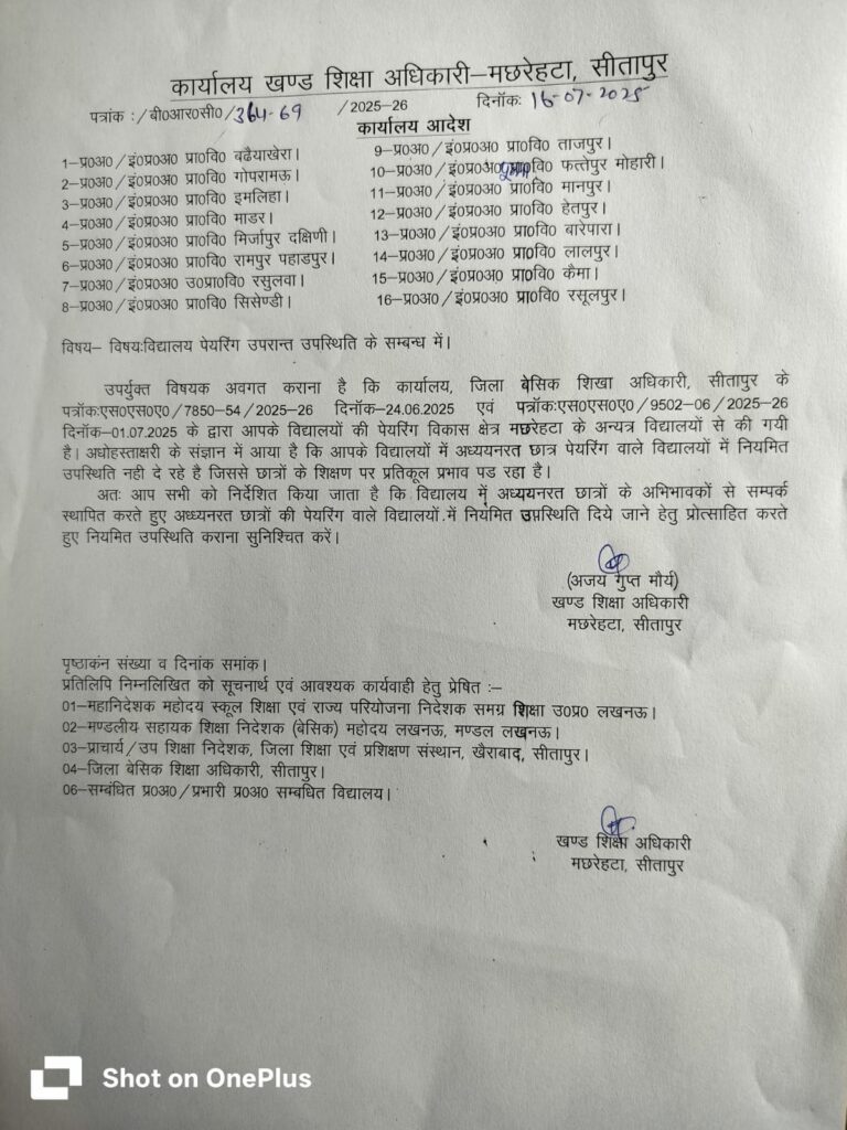 उपर्युक्त विषयक अवगत कराना है कि कार्यालय, जिला बेसिक शिखा अधिकारी, सीतापुर के पत्रोंकः एस०एस०ए०/7850-54/2025-26 दिनॉक-24.06.2025 एवं पत्रॉकः एस०एस०ए०/9502-06/2025-26 दिनॉक-01.07.2025 के द्वारा आपके विद्यालयों की पेयरिंग विकास क्षेत्र मछरेहटा के अन्यत्र विद्यालयों से की गयी है। अधोहस्ताक्षरी के संज्ञान में आया है कि आपके विद्यालयों में अध्ययनरत छात्र पेयरिंग वाले विद्यालयों में नियमित उपस्थिति नहीं दे रहे है जिससे छात्रों के शिक्षण पर प्रतिकूल प्रभाव पड रहा है।