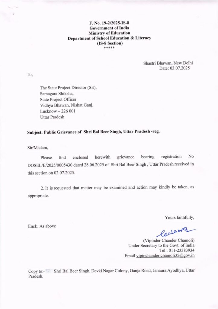 *अयोध्या, 4 जुलाई (हिंदुस्तान संवाददाता):* उत्तर प्रदेश के बेसिक शिक्षा विभाग द्वारा कम छात्र संख्या वाले स्कूलों के मर्जर के मुद्दे पर केन्द्रीय शिक्षा मंत्रालय ने महत्वपूर्ण हस्तक्षेप किया है। मंत्रालय ने राज्य समग्र शिक्षा परियोजना निदेशक को इस मामले पर पुनर्विचार करने के निर्देश दिए हैं।