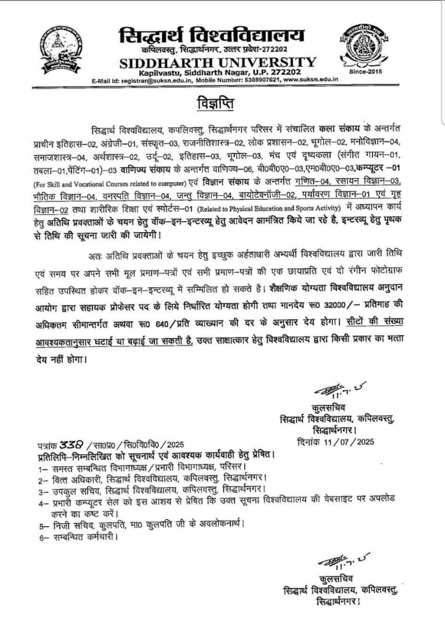 Home PRIMARY KA MASTER NEWS सिद्धार्थ विश्वविद्यालय, कपिलवस्तु, सिद्धार्थ नगर द्वारा कला संकाय के अंतर्गत विभिन्न विभागों में अतिथि प्रवक्ता हेतु विज्ञापन आमंत्रित किए गए हैं जिसमें चयन हेतु वॉक इन इंटरव्यू की तिथि बाद में जारी की जाएगी| इच्छुक अभ्यर्थी आवेदन कर सकते हैं|