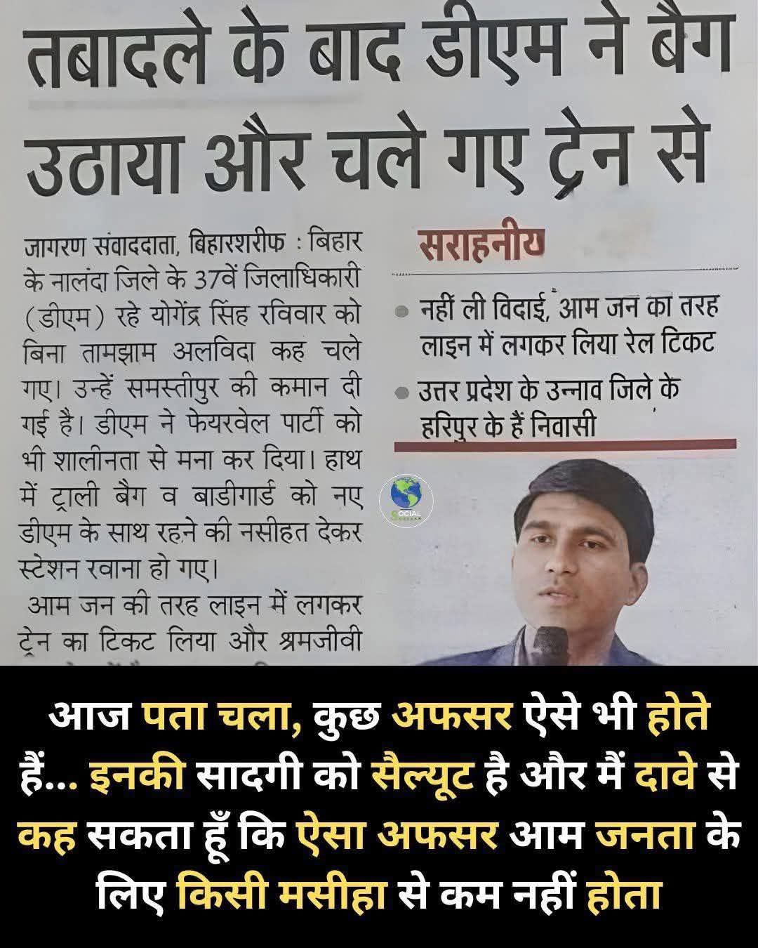 यह पोस्ट 2 जनवरी 2022 की है रिपोर्ट के मुताबिक, “नालंदा के 37वें डीएम रहे योगेंद्र सिंह की सादगी उनके स्थानांतरण के बाद दिखी। इसके चर्चे इंटरनेट मीडिया पर वायरल हो गया। बिना तामझाम के योगेंद्र सिंह जिले को अलविदा कह गए। डीएम ने फेयरवेल पार्टी को भी शालीनता से मना कर दिया। हाथ में ट्राली बैग व बाडीगार्ड को नए डीएम के साथ रहने की नसीहत देकर स्टेशन रवाना हो गए। आम पब्लिक की तरह लाइन में लगकर ट्रेन का टिकट लिया। श्रमजीवी में बैठकर पटना के लिए रवाना हो गए। उत्तर प्रदेश के उन्नाव जिले के रहने वाले योगेंद्र सिंह नालंदा में 35 महीनों तक जिलाधिकारी रहे। योगेंद्र की पहचान तेजतर्रार अफसरों में की जाती रही। अपने कार्यकाल के दौरान उनके कई फैसले चर्चा में रहे।”