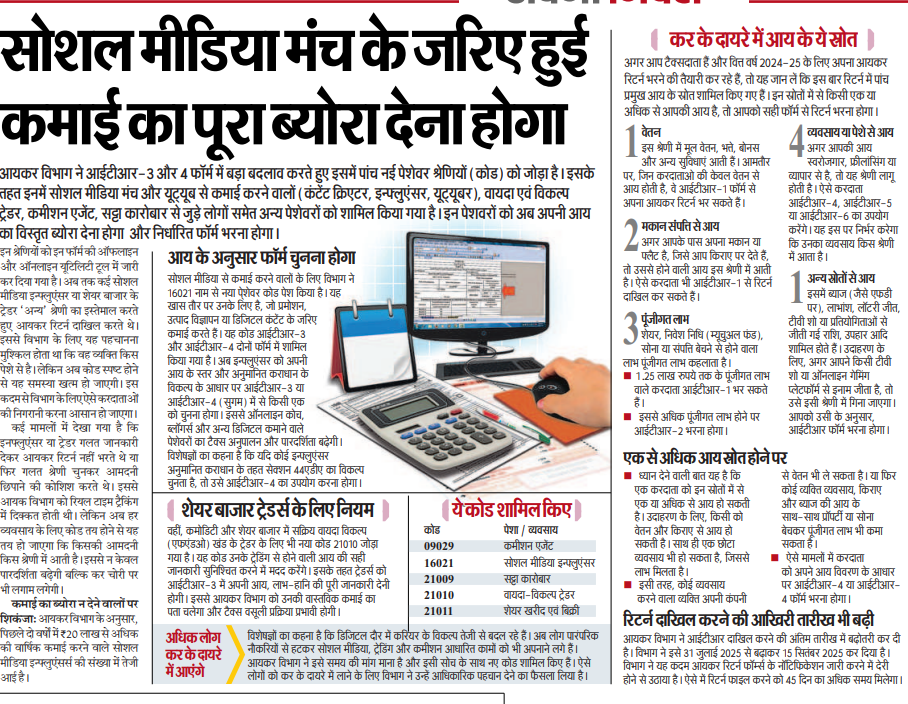 आयकर विभाग ने आईटीआर-3 और 4 फॉर्म में बड़ा बदलाव करते हुए इसमें पांच नई पेशेवर श्रेणियों (कोड) को जोड़ा है। इसके तहत इनमें सोशल मीडिया मंच और यूट्यूब से कमाई करने वालों (कंटेंट क्रिएटर, इन्फ्लुएंसर, यूट्यूबर), वायदा एवं विकल्प ट्रेडर, कमीशन एजेंट, सट्टा कारोबार से जुड़े लोगों समेत अन्य पेशेवरों को शामिल किया गया है। इन पेशवरों को अब अपनी आय का विस्तृत ब्योरा देना होगा और निर्धारित फॉर्म भरना होगा।