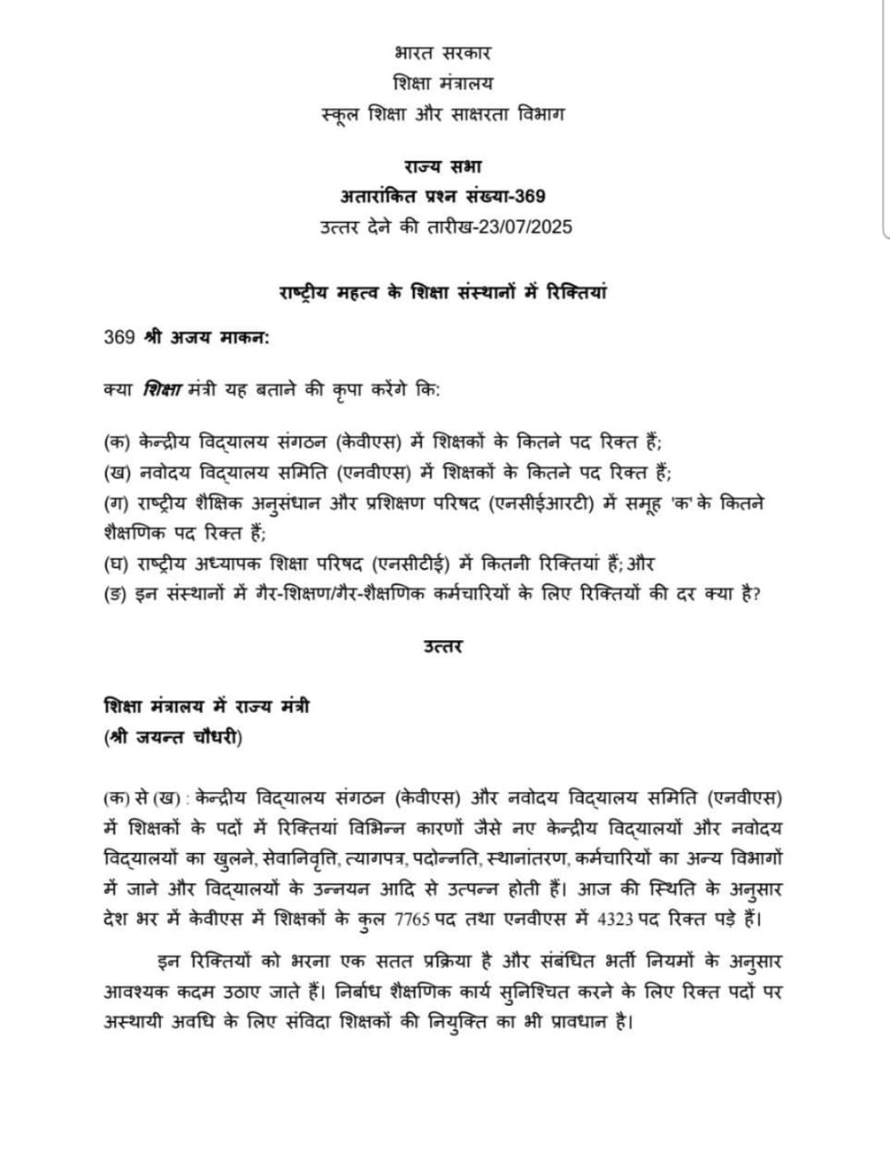♦️वर्तमान में केंद्रीय विद्यालयों में शिक्षकों के कुल 7765 पद और गैर शैक्षणिक 1618 पद खाली हैं। नवोदय विद्यालयों में शिक्षकों के कुल 4323 पद और गैर शैक्षणिक 3056 पद खाली हैं।, देखें