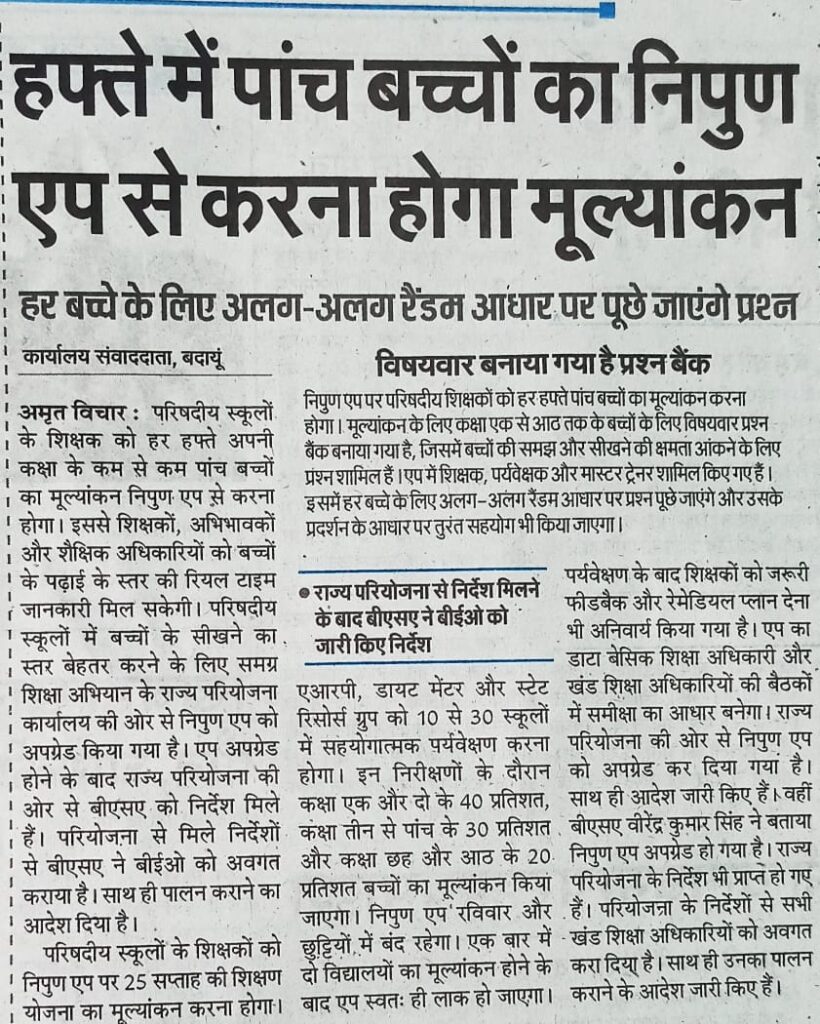 Home PRIMARY KA MASTER NEWS Primary ka master: प्रत्येक शिक्षक को निपुण एप पर करना होगा साप्ताहिक अपनी कक्षा के पांच बच्चों का आकलन