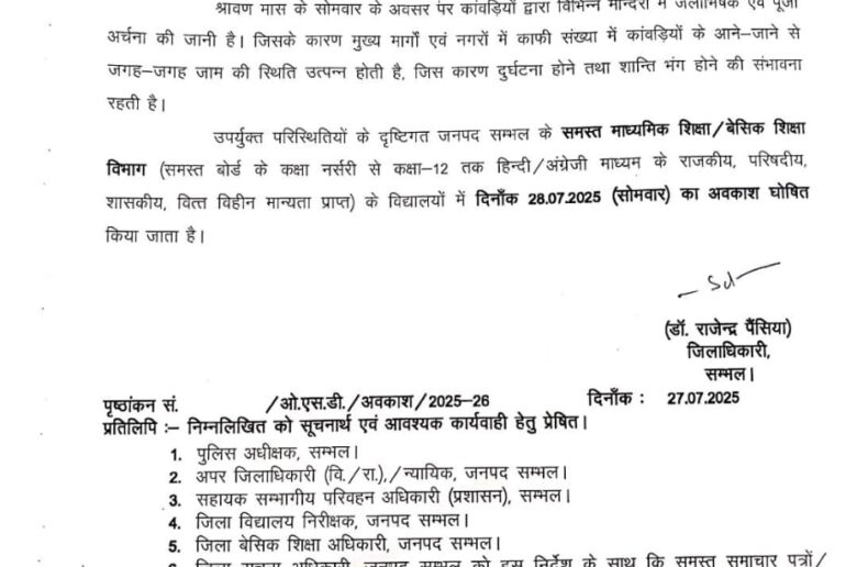 इस जिले में रहेगा आज रहेगा। अवकाश, देखें सम्बंधित आदेश