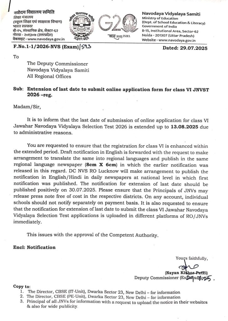 नवोदय विद्यालय प्रवेश परीक्षा हेतु आवेदन की अंतिम तिथि 13 अगस्त 2025 तक बढ़ा दी गई है।