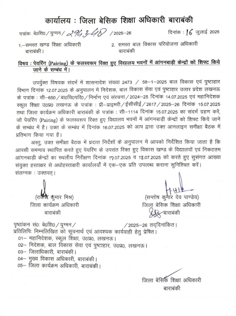 पेयरिंग (Pairing) के फलस्वरूप रिक्त हुए विद्यालय भवनों में आंगनबाड़ी केन्द्रों को शिफ्ट किये जाने के सम्बंध में आदेश
