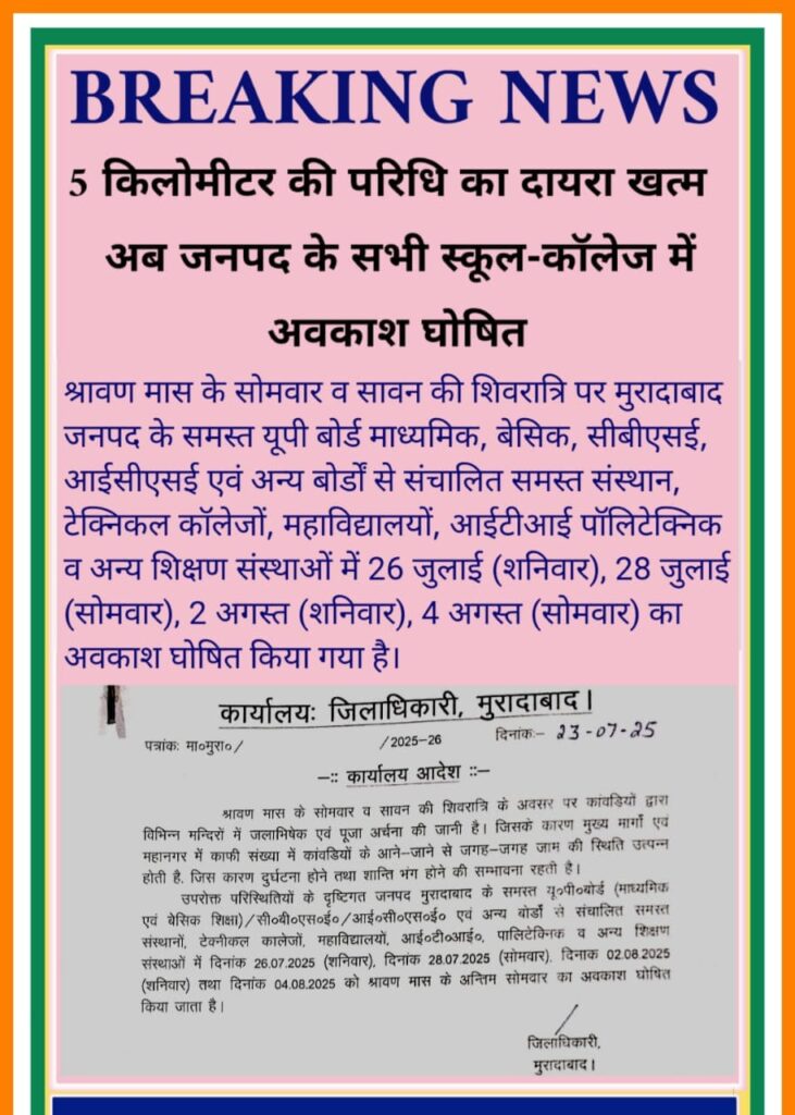 श्रावण मास के सोमवार व सावन की शिवरात्रि पर मुरादाबाद जनपद के समस्त यूपी बोर्ड माध्यमिक, बेसिक, सीबीएसई, आईसीएसई एवं अन्य बोर्डों से संचालित समस्त संस्थान, टेक्निकल कॉलेजों, महाविद्यालयों, आईटीआई पॉलिटेक्निक व अन्य शिक्षण संस्थाओं में 26 जुलाई (शनिवार), 28 जुलाई (सोमवार), 2 अगस्त (शनिवार), 4 अगस्त (सोमवार) का अवकाश घोषित किया गया है।