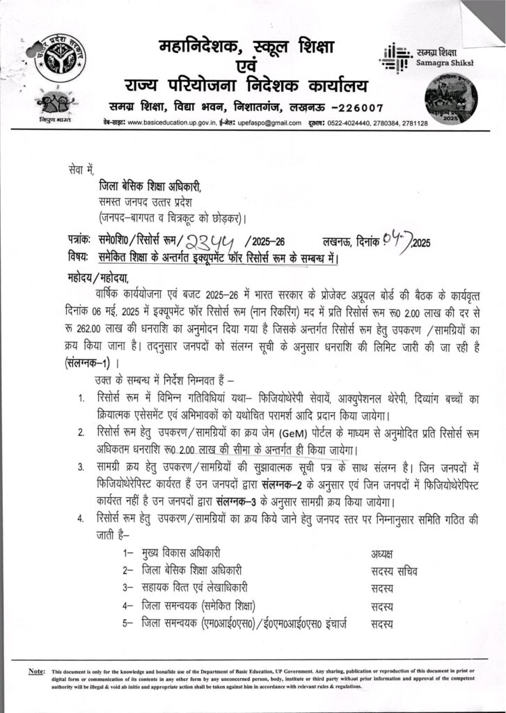 Home PRIMARY KA MASTER समेकित शिक्षा के अन्तर्गत इक्यूपमेंट फॉर रिसोर्स रूम के सम्बन्ध में।