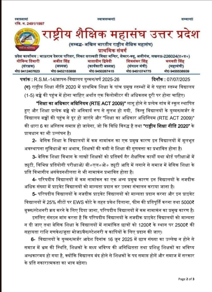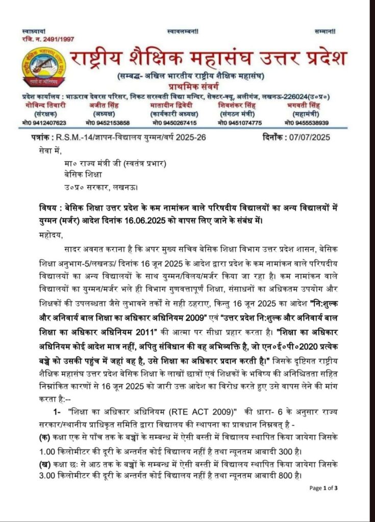 स्कूल मर्जर/विलय के निर्णय को वापस लिए जाने के संबंध में राष्ट्रीय शैक्षिक महासंघ, उत्तर प्रदेश ने बेसिक शिक्षा मंत्री जी को लिखा प्रार्थना पत्र