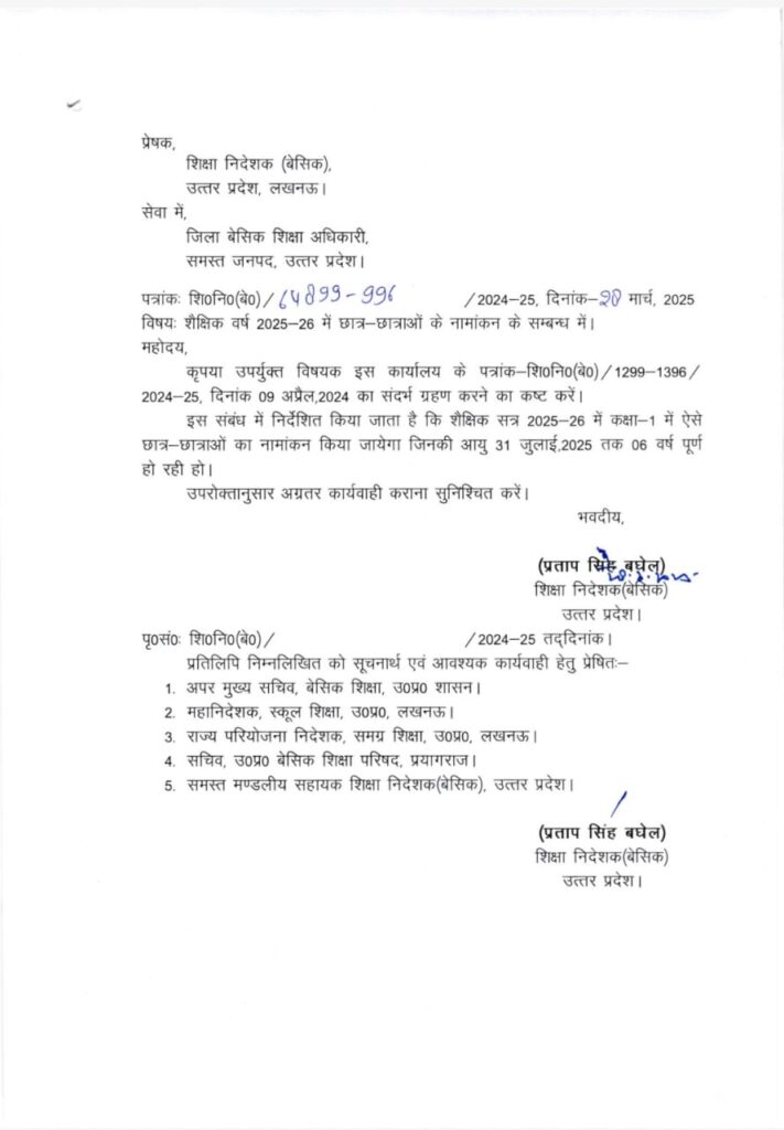 परिषदीय विद्यालयों के कक्षा एक में नामांकन के लिए बच्चों की उम्र 31 जुलाई 2025 तक 06 वर्ष पूर्ण होना चाहिए।