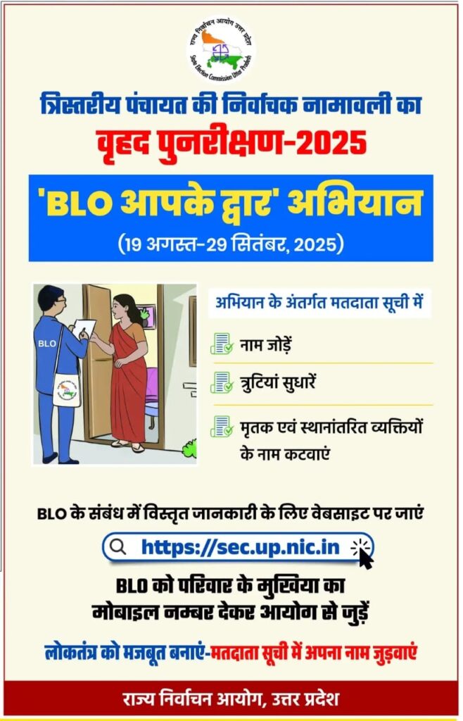 उत्तर प्रदेश में त्रिस्तरीय पंचायत की निर्वाचक नामावली का वृहद पुनरीक्षण 2025 के लिए ‘BLO आपके द्वार’ अभियान 19 अगस्त से 29 सितंबर 2025 तक चलाया जा रहा है। इस अभियान में मतदाता सूची में नाम जोड़ने, त्रुटियां सुधारने तथा मृत एवं स्थानांतरित व्यक्तियों के नाम हटाने का कार्य किया जाएगा।