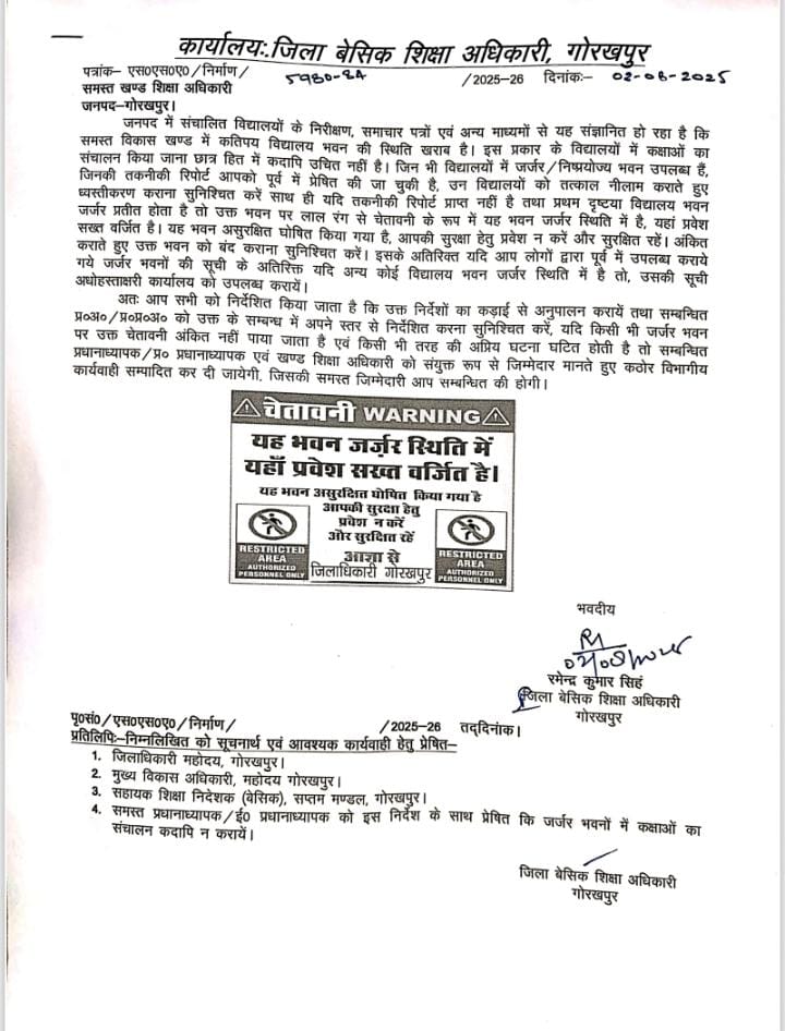 जर्जर भवन पर निम्न चेतावनी अंकित नहीं की तो प्रधानाध्यापक कार्यवाही के लिए रहें तैयार