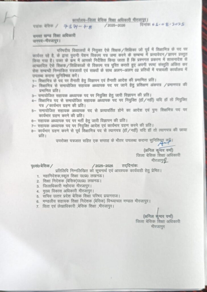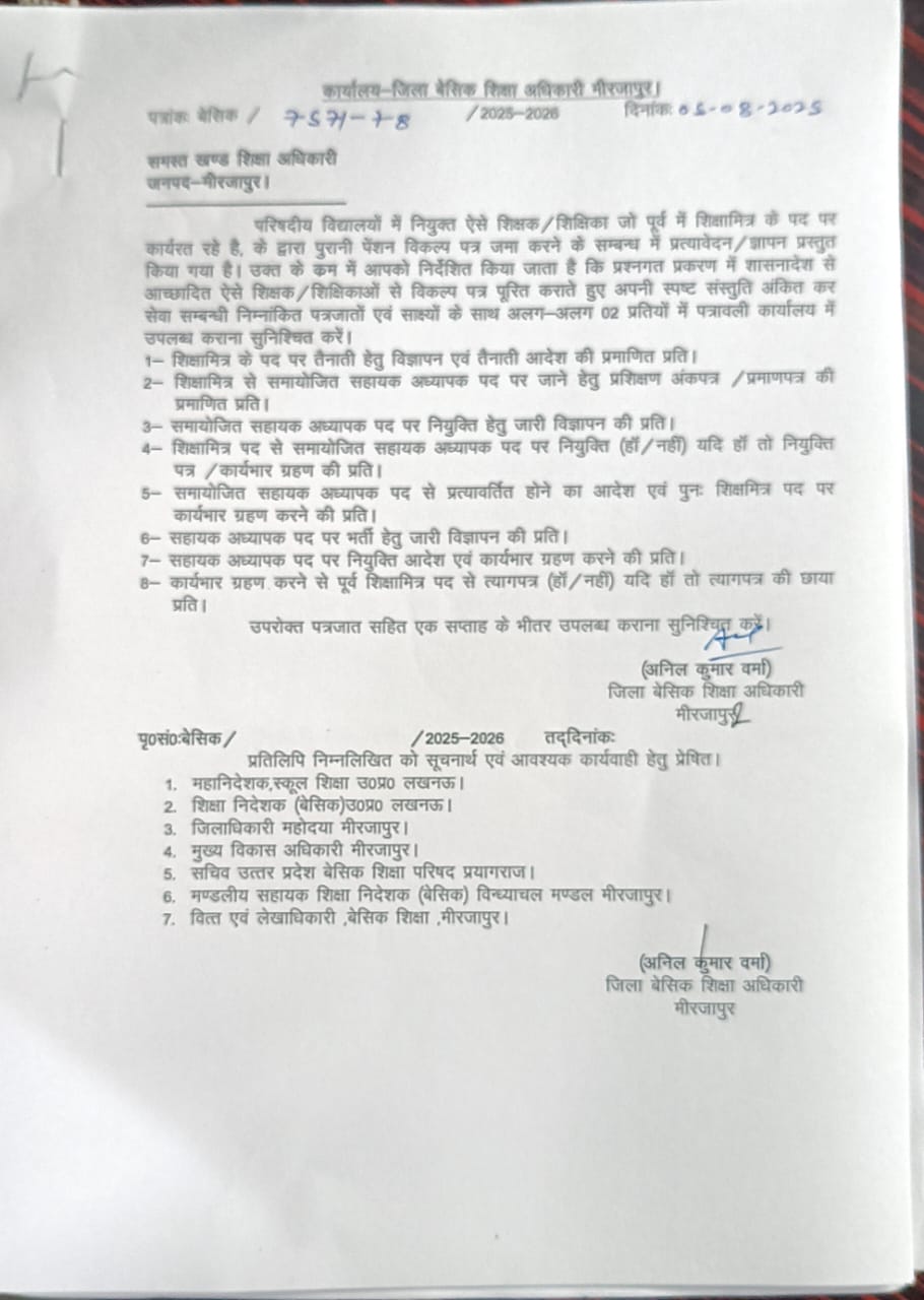 शिक्षामित्र से समायोजित सहायक अध्यापक पद पर कार्यरत शिक्षकों से पुरानी पेंशन हेतु विकल्प पत्र लेने के सम्बन्ध में आदेश जारी