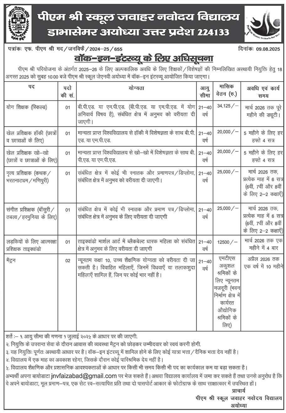 पीएम श्री स्कूल जवाहर नवोदय विद्यालय में अस्थायी शिक्षक बनने का मौका, मासिक वेतन 34 हजार प्लस