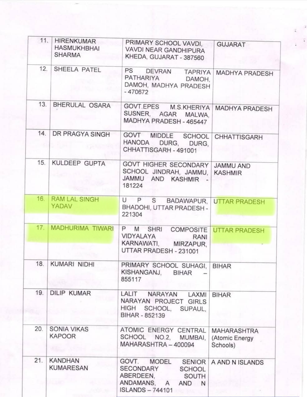 उत्तर प्रदेश से दो शिक्षकों भदोही से श्री राम लाल यादव तथा मिर्जापुर से श्रीमती मधुरिमा तिवारी जी सहित देश भर से कुल 45 लोगों को मिलेगा इस वर्ष का प्रतिष्ठित पुरस्कार। सभी सम्मानित शिक्षकों को हार्दिक बधाई।