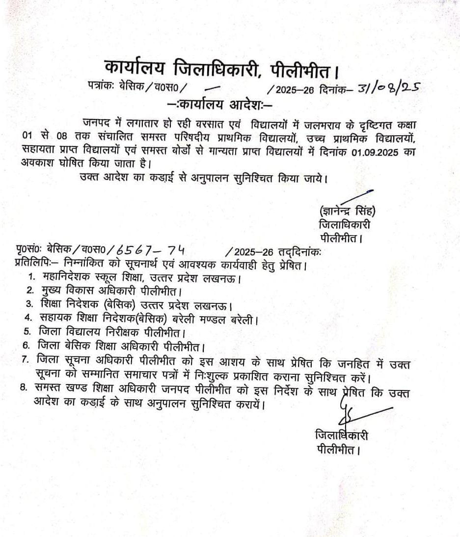 जनपद में लगातार हो रही बरसात एवं विद्यालयों में जलभराव के दृष्टिगत कक्षा 01 से 08 तक संचालित समस्त परिषदीय प्राथमिक विद्यालयों, उच्च प्राथमिक विद्यालयों, सहायता प्राप्त विद्यालयों एवं समस्त बोडों से मान्यता प्राप्त विद्यालयों में दिनांक 01.09.2025 का अवकाश घोषित किया जाता है।