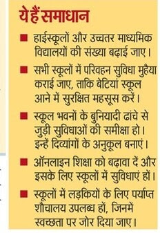राष्ट्रीय मानवाधिकार आयोग (एनएचआरसी) के अध्ययन में यह खुलासा हुआ है। आयोग ने सरकार से हाई स्कूल और उच्चतर माध्यमिक विद्यालयों की कमी दूर करने एवं परिवहन साधन उपलब्ध कराने की मांग की है, ताकि बेटियां पढ़ सकें।